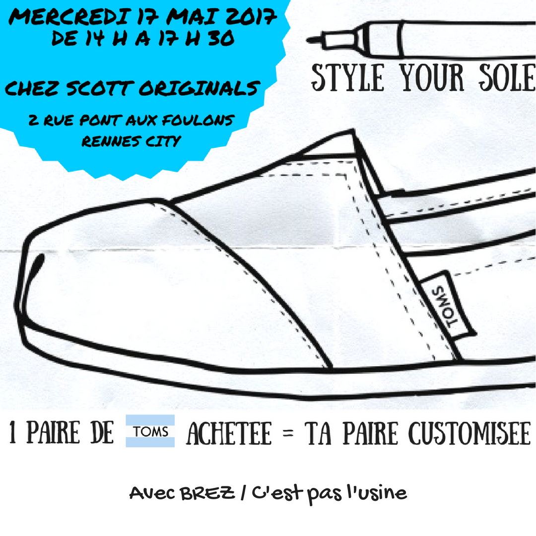 Le 17 mai dernier, entourée d’artistes locaux et du blogueur Barbichette, la marque TOMS organisait l’événement « style your sole » à Rennes. A cette occasion, j’ai été conviée à suivre l’opération ainsi que les ateliers de customisation mis en place chez Scott Originals, rue Pont aux Foulons. Une belle occasion de (re)découvrir les valeurs d’une enseigne novatrice et sociale et de se pencher sur deux artistes talentueux : C’est pas l’usine et Brez.