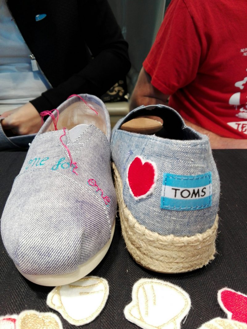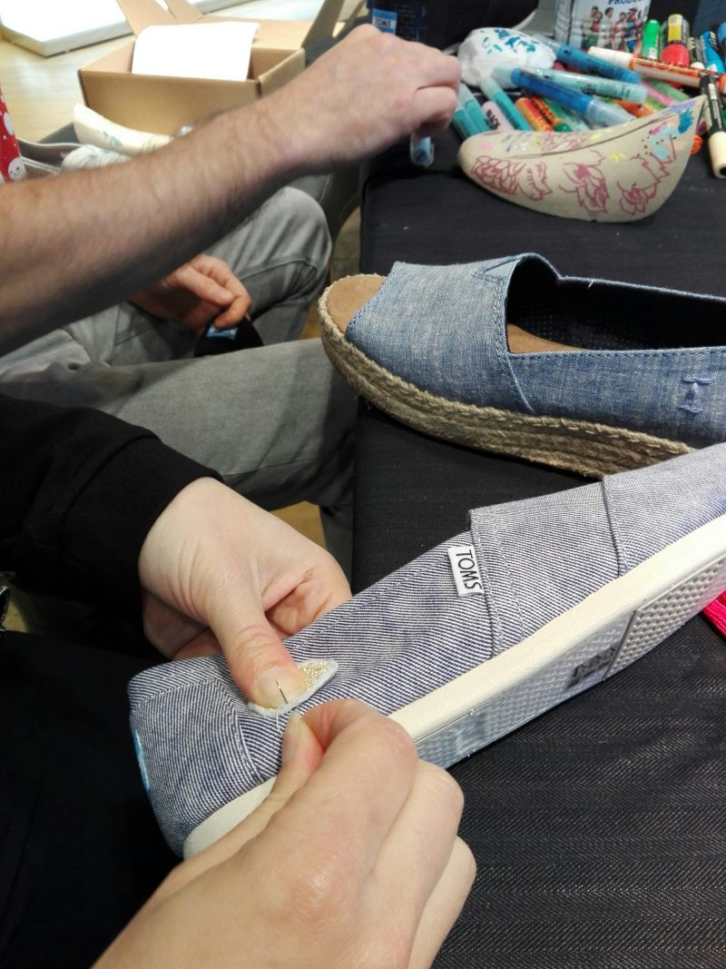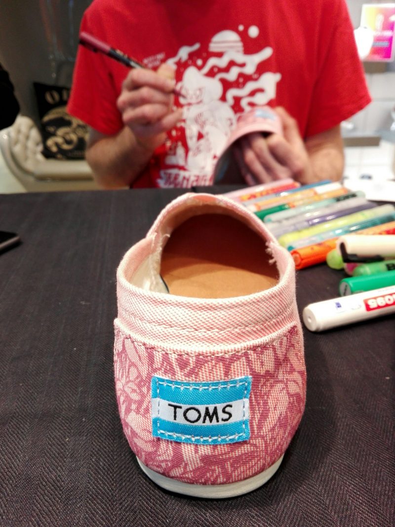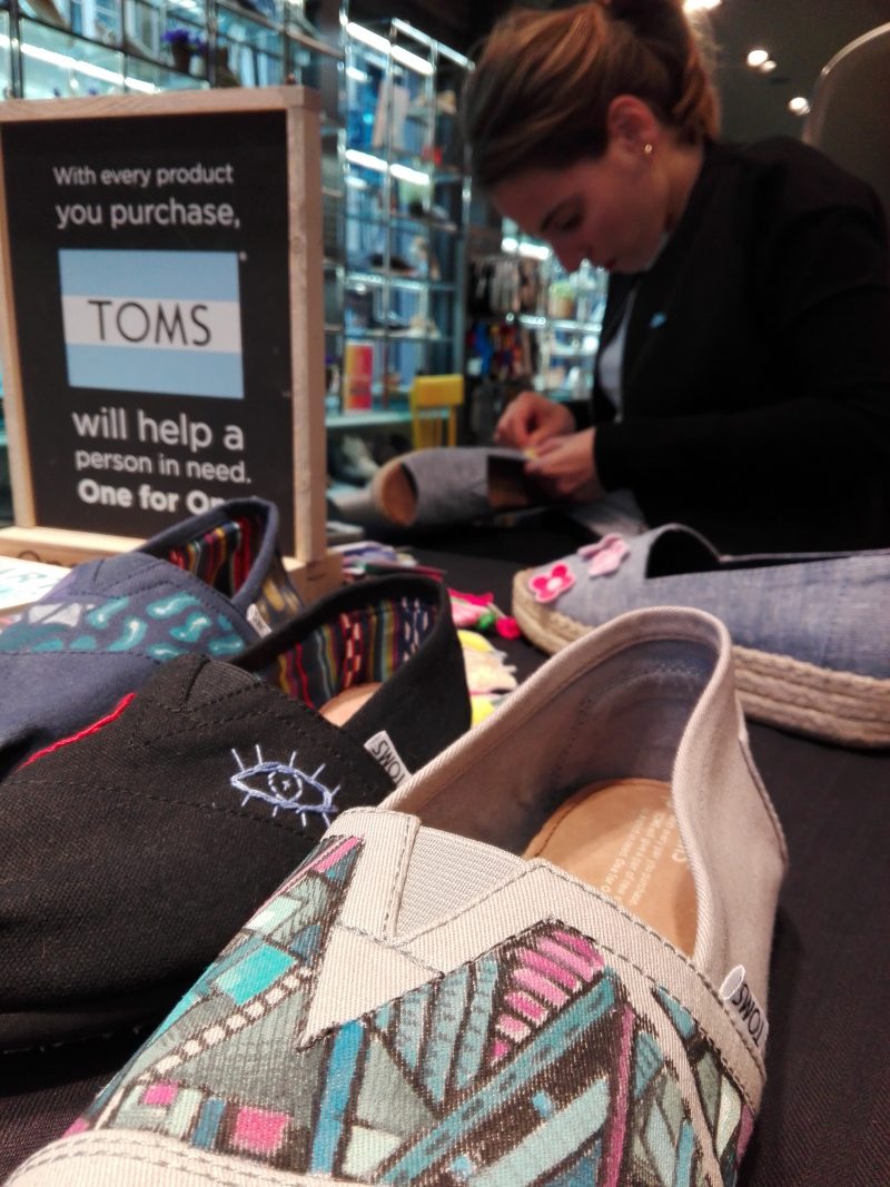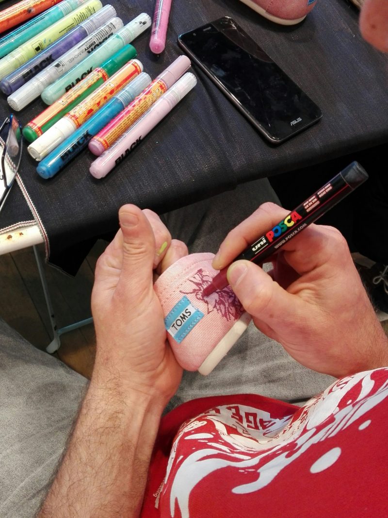 Cet événement proposait aux clients Rennais, de se voir offrir, contre une paire TOMS achetée, une customisation par Morgane (C’est pas l’usine) et Mathias (Brez). Au programme : broderies, mots doux et dessins au posca. L’idée était chouette et nos deux artistes n’ont pas vraiment chômé…